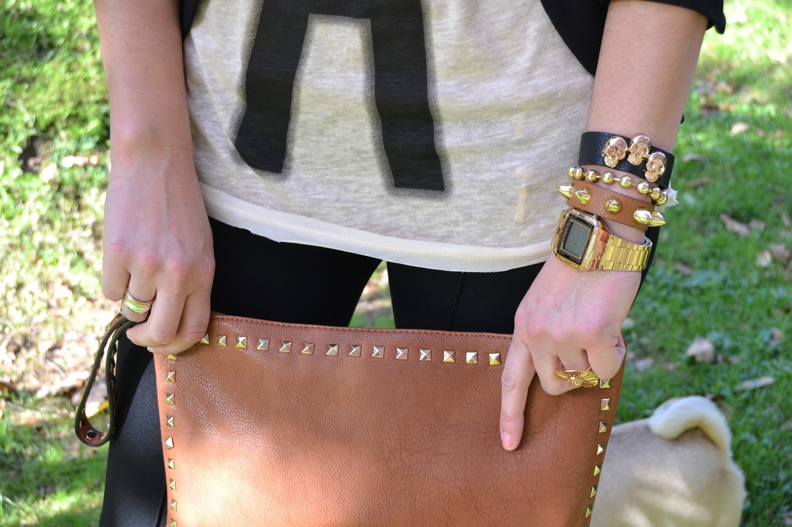Para los comples, pues tambien un poco en el estilo de esta epoca que estoy ahora, pulseras de tachas y calaveras y bolso de tipo Valentino.