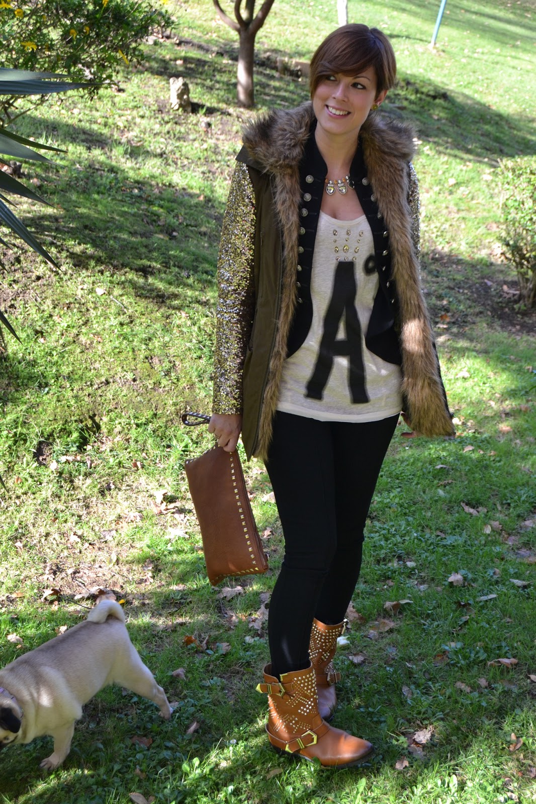 Me había comprado las botas moteras con tachas de zara y me apetecía estrenarlas así que ni corta ni perezosa me puse mi parka con paillets y a la calle.
