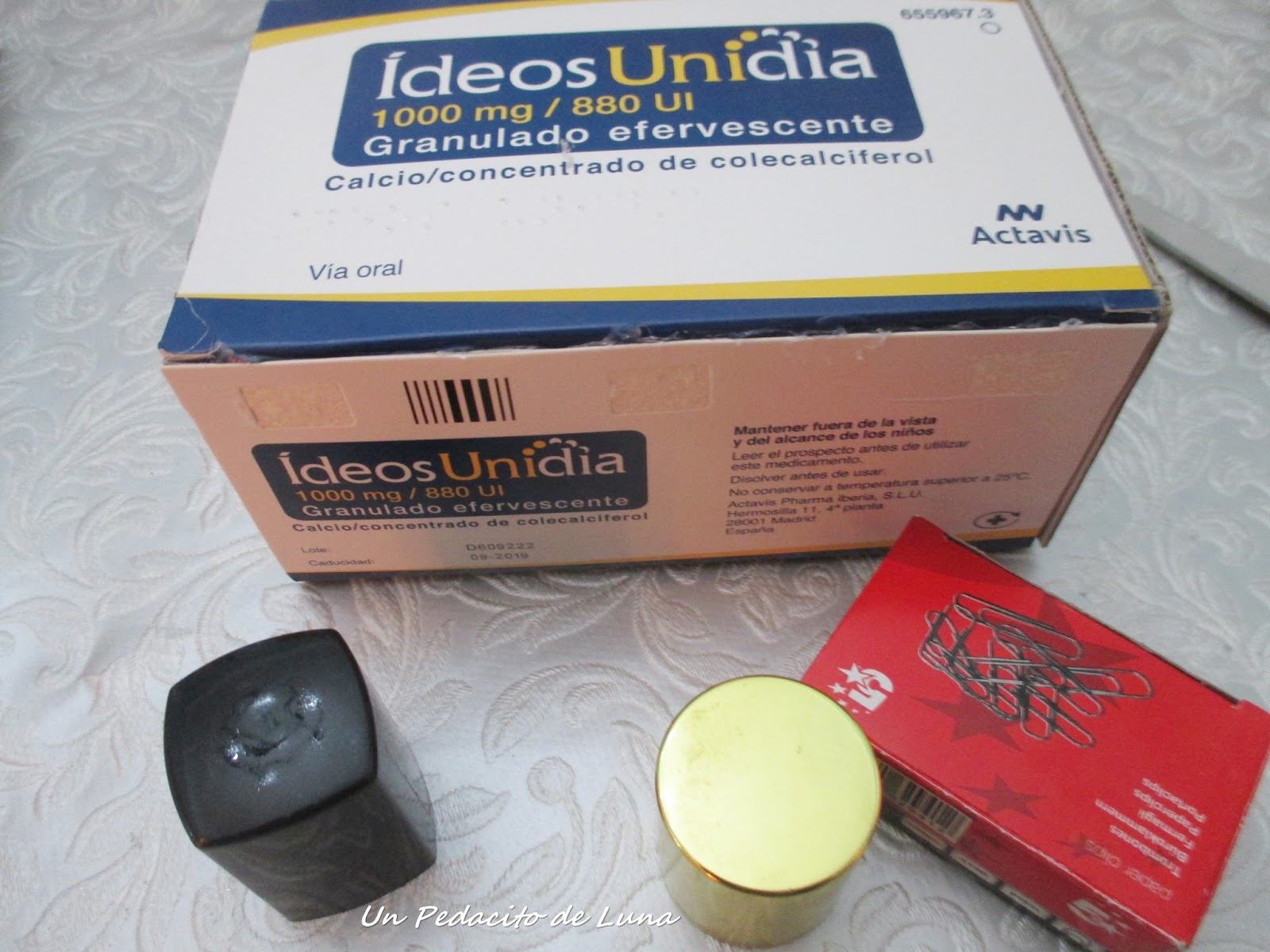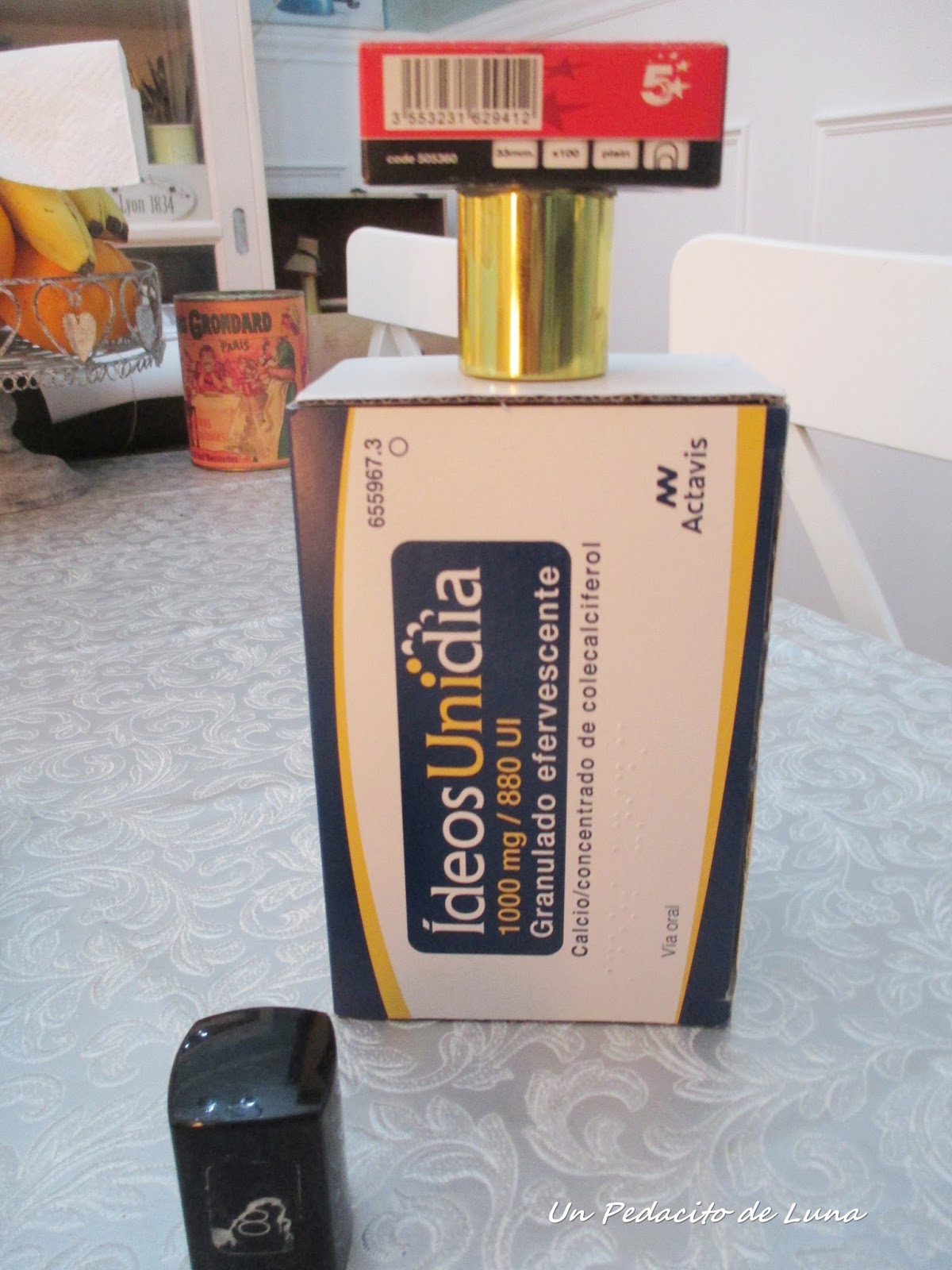 Me hice con un par de cajitas de la medida más o menos adecuada, una del calcio que tomo, otra de grapas y un tapón de alguno de mis aceites esenciales favoritos en estética.