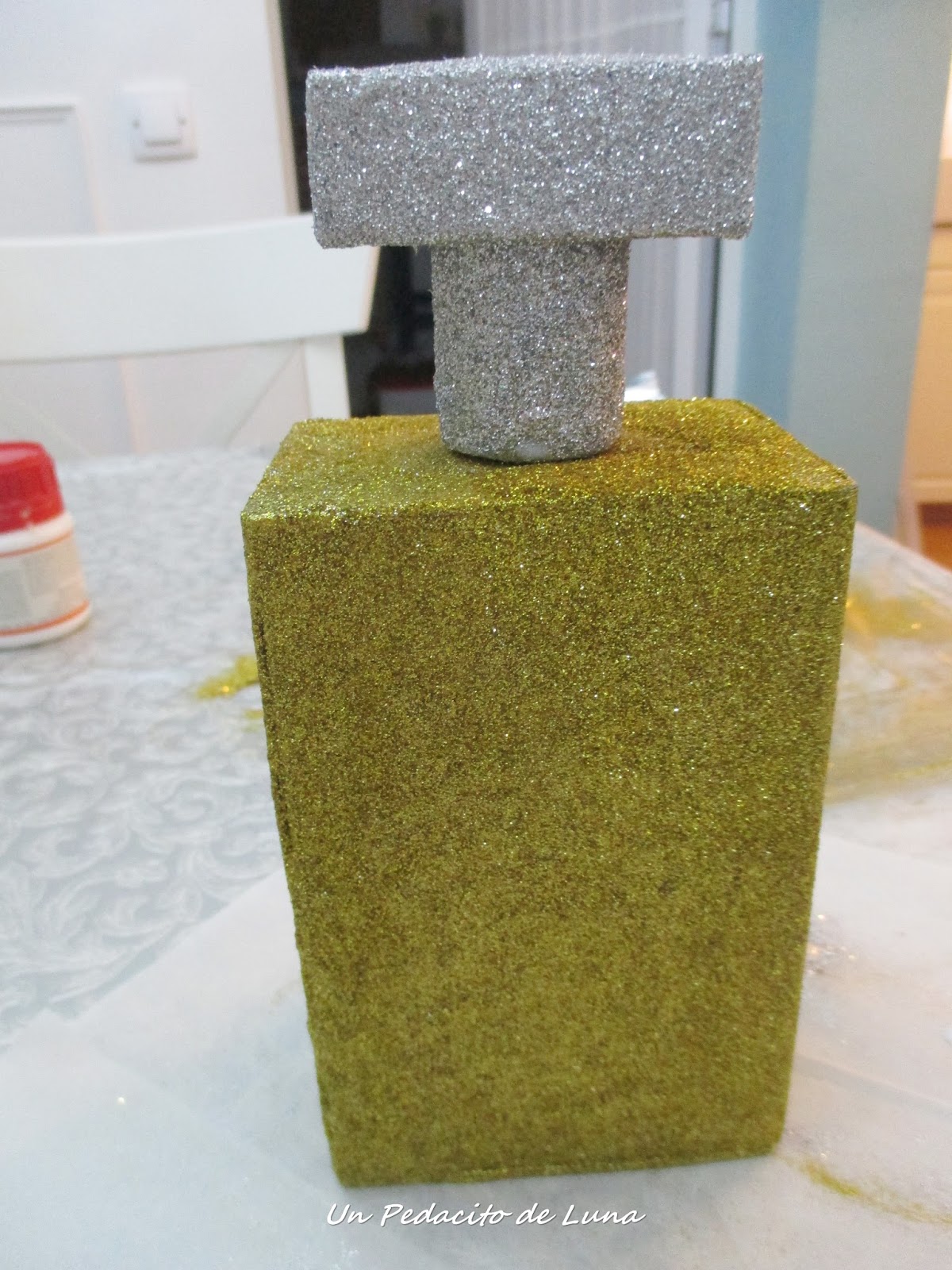 A la tapa le hice el mismo proceso que al bote de perfume.Mod podge y glitter hasta cubrir bien para luego volver a dar mod podge y fijar la purpurina.