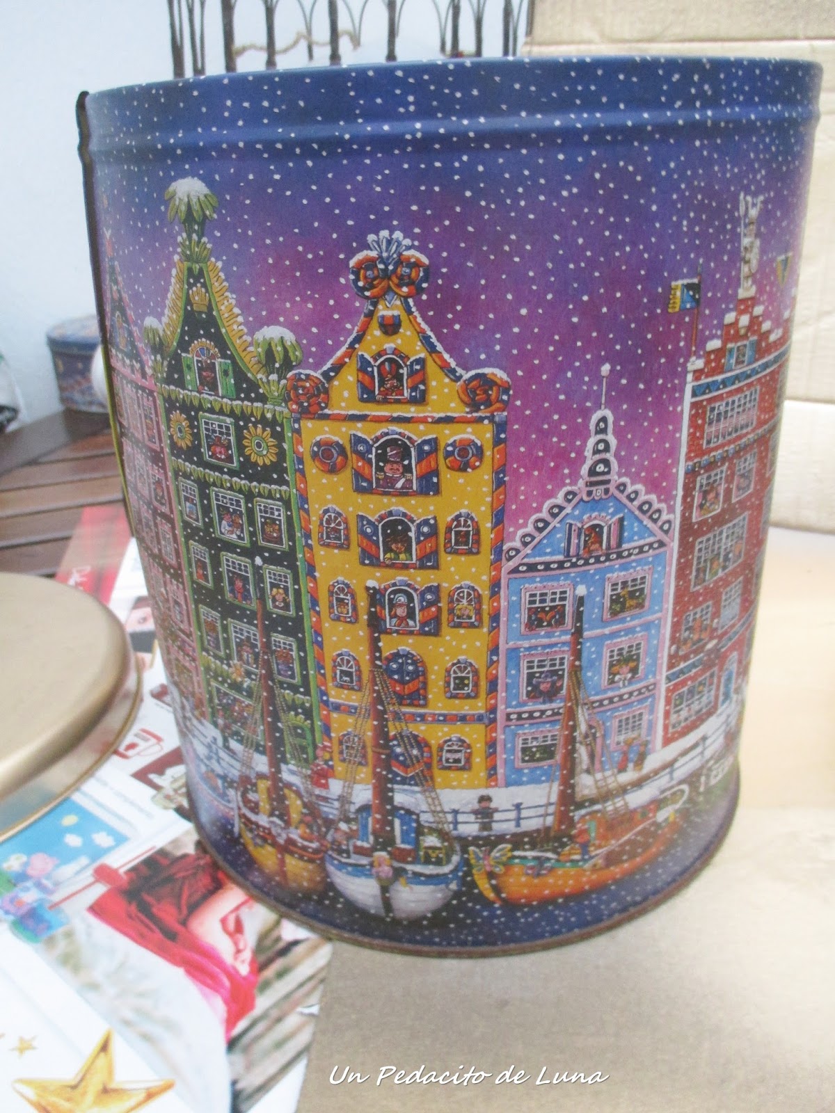 También customizamos esta lata ya en desuso. muy navideña ella....Pintada en dorado con spray en varias capas hasta cubrir bien toda la superficie.