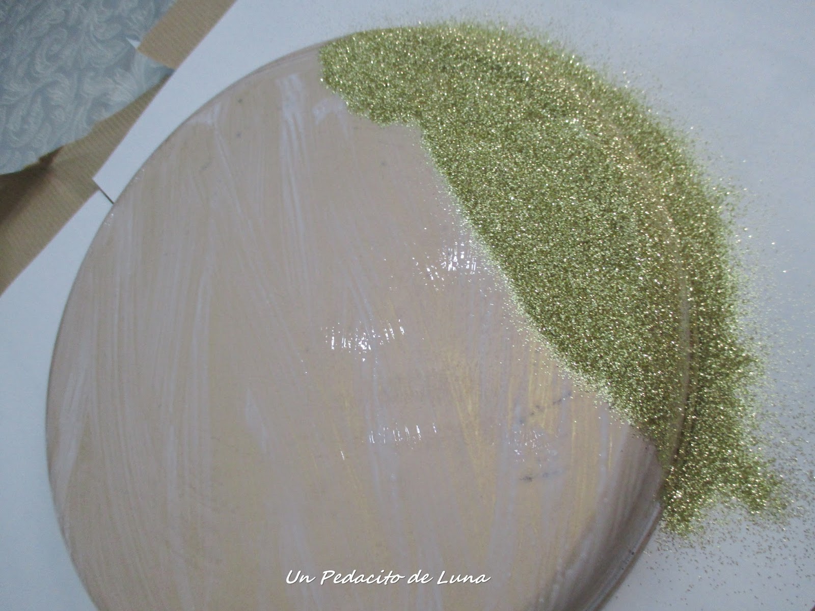 Se trata de impregnar toda la superficie con mod podge y esparcir el glitter por todas partes hasta cubrir.