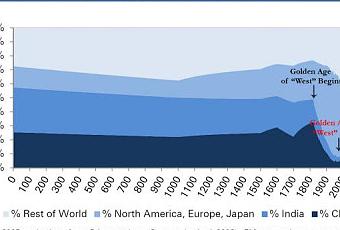 La imagen de desarrollo en el mundo, refleja arriba el mundo occidental mas Japón. En los azules de abajo China e India y muestra el gran bache decreciente hasta que en el tercio final de siglo XX comienzan a subir.