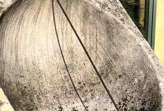 El más deteriorado es un reloj cilíndrico vertical con gnomon orientado también según eje del mundo. Las marcas de las horas son elipses: cortes de una superficie cilíndrica por el plano de la sombra del gnomon.
