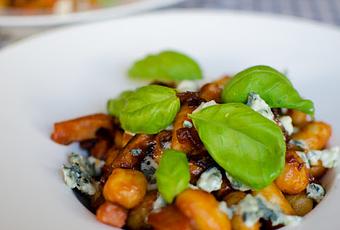 2 cebollas moradas pequeñasmedia bandeja de chapiñones portobello100 gramos de bacon ahumado250 gramos de gnoquisqueso roquefortalbahaca frescaaceite, sal y pimienta