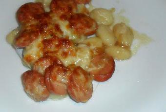 Elaboración:En primer lugar pelamos y picamos la cebolla y los dientes de ajo muy finitos. Echamos aceite de oliva en una sartén y los pochamos, junto con una pizca de sal, hasta que la cebolla se vuelva transparente.Cortamos las salchichas en rodajas. Las agregamos a la cebolla y al ajo. Dejamos que éstas se doren ligeramente y, a continuación, añadimos la cerveza, la salsa Perrins y las especias. Dejamos que se cocinen durante cinco minutos aproximadamente.Mientras tanto, cocemos los ñoquis siguiendo las instrucciones del fabricante. Cuando estén listos, los escurrimos bien, reservando un poco de agua de la cocción. Añadiremos un poco de esta agua a las salchichas y las dejaremos al fuego unos minutos más.Una vez escurridos los ñoquis, los colocamos en una fuente refractaria y le distribuimos la mantequilla, cortada en dados, por encima.Añadimos entonces las salchichas con las salsa. Agregamos el queso rallado por encima.Lo metemos al honro precalentado a 180ºC, hasta que el queso quede perfectamente gratinado.