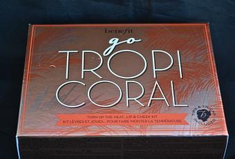 Próximo lanzamiento de Benefit, kit de labios y mejillas compuesto por mini tallas del chachatint (colorete liquido en tono mango), colorete en polvo CORALista, iluminador liquido High Beam y el gloss coralista. Todo ello en una de las cajas características e inconfundibles de la marca que se distingue por su exclusivo packaging de cartón con cierto aire retro.