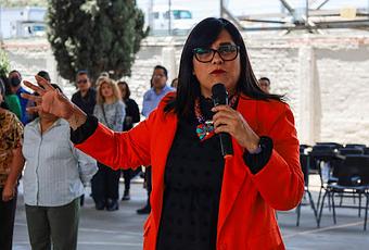 La presidenta municipal de Texcoco, Sandra Luz Falcón Venegas durante su visita a la preparatoria de Texcoco al inicio del ciclo escolar 2023-2024, los alumnos le solicitaron su apoyo para que se les dotara de butacas escolares.