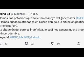 Por Ana Dora.-“De inmediato atendimos, ambos se encuentran bien y el Gobierno potosino mantiene contacto con ellos y sus familiares de San Luis Potosí”, declaró Luis Enrique Hernández Segura, director del Instituto de Migración y Enlace Internacional en San Luis Potosí, respecto a Alina Esparza Herrera y Diego Alejandro Herrera, potosinos que se encuentran varados en la ciudad de Cusco, Perú en medio de una crisis nacional y que solicitan ayuda al gobierno mexicano.