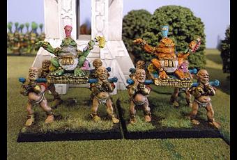 More Wizards on litters. The Slann on the left is one of the few non-citadel miniatures, from Gaspez Arts.