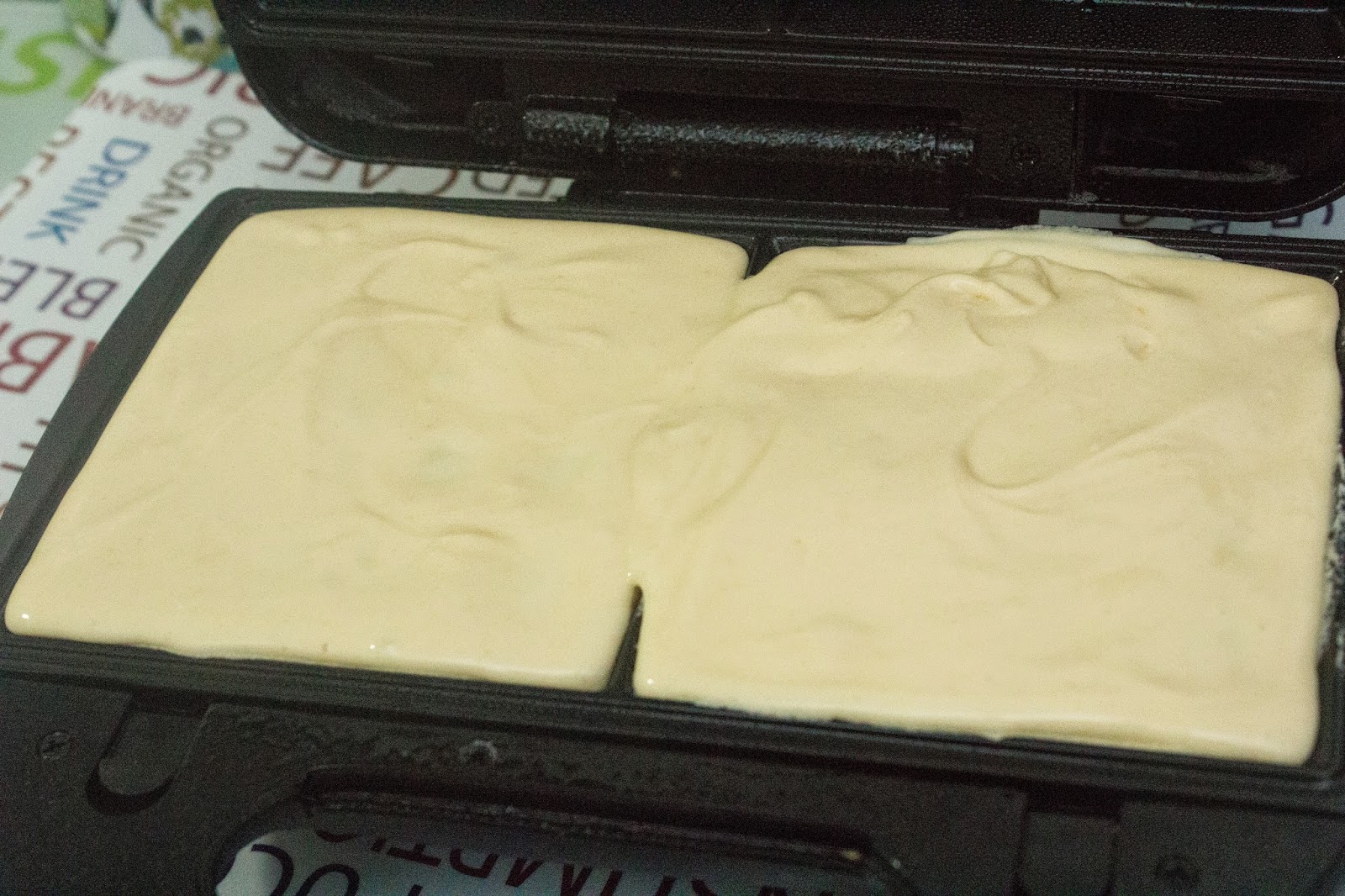 Pon la masa dentro de la gofrera. No lo llenes mucho porque luego se sale toda la masa por los lados.