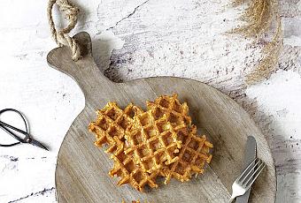 Hacer los fideos Yatekomo de pollo al curry en 200 ml de agua durante 3-4 minutos, hasta que se haya reducido todo el agua. Agregar el sobrecito de curry que viene en el envase y remover bien. Dejar entibiar. Mientras cortar el bacon y cuadraditos pequeños y sofreír en una sartén hasta que se dore. Batir los huevos e incorporar el tomate frito y el bacon, mezclar. Añadir los fideos y unirlo todo bien. Calentar bien la gofrera y echar 2 o 3 cucharadas de la mezcla. Dejar que se hagan 3-4 minutos o hasta que alcancen el dorado que más nos guste. Comer al momento.