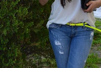 Boyfriend jeans, white tank and black pumps with a fluor touch.