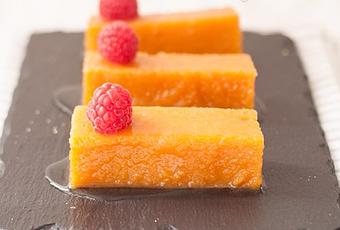 Volcamos el puré en los moldes donde queramos enfriarlo. Yo he usado un molde cuadrado de emplatar, para hacer las barritas, y unos moldes cuadrados de silicona para hacer los bombones.
