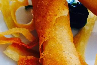 - Recortamos cada hoja en cuadrados de forma que el resultado sea del tamaño de un puro. Colocamos a 3 ó 4cm de un lado un cordón de ajoarriero y extendemos. Enrollamos teniendo cuidado de cerrar los extremos y con un pincel mojamos con agua el final para que el purito quede sellado. Freímos en abundante aceite y cuando estén doraditos pasamos por papel absorbente para retirar el exceso de aceite.