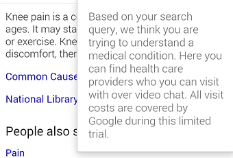 Por la imagen de portada, que es una captura de pantalla del servicio, podemos deducir que si este servicio se pone en marcha para todo el público, será un servicio pago, ya que la tarjeta que ofrece la consulta con un médico a través de un vídeo chat, indica que en estos momentos los gastos son pagos por Google durante el período de pruebas.