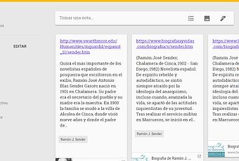Buscaremos la etiqueta que creamos (en este caso la de Ramón J. Sender) y haciendo clic en los tres puntos de cada nota las añadimos al documento para trabajar ya con ellas.