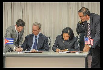 Norelys Morales Aguilera.─ Al firmar un acuerdo entre la Empresa de Telecomunicaciones de Cuba (Etecsa) y Google este lunes 12 de diciembre, para ofrecer el servicio de Google Global Cache, queda en evidencia que no ha sido la Isla la que ha provocado la baja velocidad de conexión para los cubanos. El acuerdo rubricado por los presidentes ejecutivos de Google y de Etecsa, Eric Schmidt y Mayra Arevich Marín, respectivamente, permitirá utilizar la tecnología del gigante tecnológico, para dar una mayor velocidad y calidad de las prestaciones y la optimización de la red internacional de Etecsa, y por ende, reducir el tiempo de respuesta al entregar localmente algunos de los contenidos más populares y de mayor ancho de banda, como los vídeos YouTube.