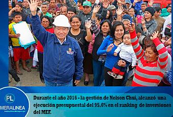Según el Ministerio de Economía y Finanzas (MEF), el Gobierno Regional de Lima (GORE LIMA) – cerro el año fiscal 2016 – ocupando el primer lugar del ranking de inversiones, con una ejecución presupuestal del 95.6%.Para el gerente regional de Planeamiento, Presupuesto y Acondicionamiento Territorial Lic. Mario Verano Conde – estas son alentadoras y es el resultado del trabajo responsable y planificado que ha ejercido el equipo de trabajo, bajo el liderazgo y experiencia del titular del pliego Nelson Chui Mejía.