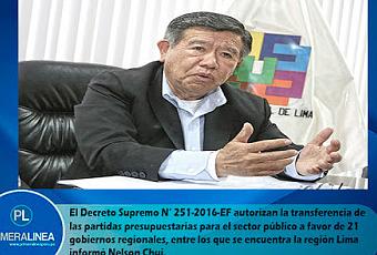 Asignación por bonos excepcionales por cumplimiento de metas supera los 2 millones de soles y serán destinados a dos mil trabajadores de la regiónLa transferencia de recursos económicos adicionales del Ministerio de Economía y Finanzas para bonos excepcionales por cumplimiento de metas institucionales en el sector Salud – es un nuevo anuncio que hizo el gobernador regional de Lima – Nelson Chui Mejía.