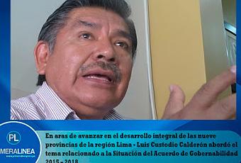 En aras de avanzar en el desarrollo integral de las nueve provincias de la región Lima - Custodio Calderón abordó el tema relacionado a la Situación del Acuerdo de Gobernabilidad 2015 – 2018, que cuenta con 31 políticas públicas a nivel regional y en las dimensiones económicas, sociales, institucionales y ambientales.“La idea es ofrecer inclusión y equidad a la población, en especial a la primera infancia, generando confianza para encaminar los esfuerzos y ofrecer una vida digna a todos”, puntualizó la primera autoridad administrativa de la entidad regional.