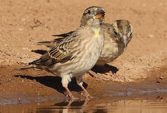 Pareja de gorriones chillones hidratándose en el borde de una pequeña charca. Uno de los individuos vocalizando.