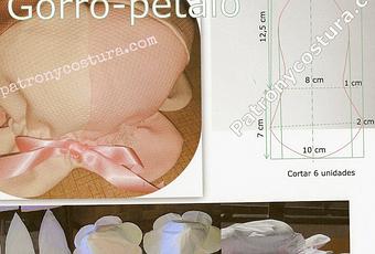 Para hacer este gorro necesitamos 0, 25 m de tejido piqué en ambos tonos y 0, 25 cm de batista blanca para forro, 0,5 cinta de raso.Cortamos 6 unidades de los pétalos que ensanchamos según talla queramos, medimos el contorno de la cabeza de la niña y dividimos entre 6 y esa es la anchura del pétalo. O si lo prefieres un poco más amplio le agregas 0,3 mm al ancho de cada pétalo. En este caso lo he hecho más amplio, porque quería fruncir con goma elástica, así si hay viento no se vuela, queda más ajustada.