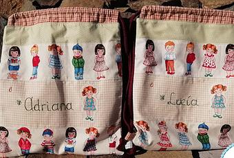 Ya sea una flor bordada junto a cada nombre, dos corazones, dos nenas con coletas como Adriana y Lucía o los cordones de las asas en diferentes colores, cada mochila está repleta de detalles y cariño.