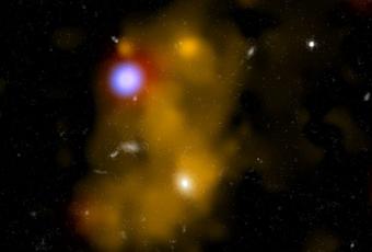 Un estudio profundo de 29 gotas gigantescas de gas de hidrógeno se ha llevado a cabo con el observatorio de rayos X Chandra para identificar la fuente de la inmensa energía necesaria para iluminar estas estructuras. Estas misteriosas manchas, llamadas "manchas Lyman-alfa" por los astrónomos debido a la luz que emiten, miden varios cientos de miles de años luz de diámetro y se observan cuando el Universo tenía solamente dos mil millones de años, aproximadamente el 15% de su edad actual. La imagen compuesta muestra una de las mayores manchas observadas en este estudio. Gas de hidrógeno brillante en la gota es mostrada mediante una inmagen óptica Lyman-alfa (de color amarillo) del Observatorio Nacional de Astronomía del telescopio Subaru de Japón. Una galaxia situada en la burbuja es visible en una imagen óptica de banda ancha (blanco) del telescopio espacial Hubble y una imagen infrarroja del telescopio espacial Spitzer (rojo). Por último, la imagen del Observatorio de rayos X Chandra en azul muestra evidencia de un creciente agujero negro supermasivo en el centro de la galaxia. La radiación y las salidas de este agujero negro activo son lo suficientemente potentes como para iluminar y calentar el gas en la burbuja. La radiación y los vientos de la rápida formación estelar que ocurren en la galaxia se cree que tienen efectos similares. Una clara evidencia es observada en otros cuatro agujeros negros activos.