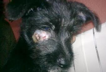 Goten fue abandonado en la perrera llenito de mordiscos y con un bulto enorme en el ojo, le vimos cuando fuimos a sacar otro y no pudimos dejarle ahí... estaba hecho una pena, tenia toda la cabeza destrozada a mordiscos, debe de haber llevado una vida muy dura a pesar de lo peque que es, seguramente le han tenido encerrado con mas perros que le mordian y pegaban, y como es tan bolote y tontorrón, siempre saldría perdiendo.