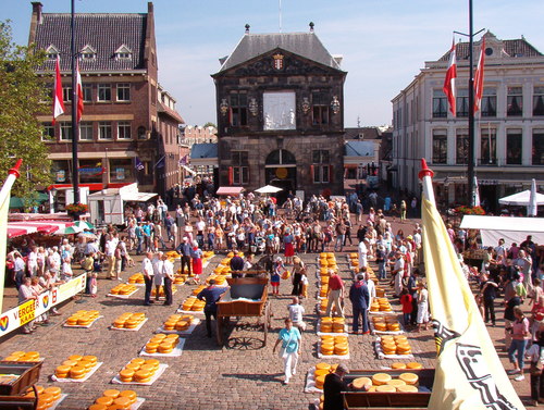 Las piezas que se venden en este mercado, para alborozo de los turistas, siguen pesándose en De Waag, el edificio que veis al fondo donde tradicionalmente se lleva pesando el queso desde su construcción en el siglo diecisiete.El gran relieve de mármol que adorna la fachada deja bien clara la función del pabellón, pues muestra a unos pobres hombres desharrapados que desde el suelo venden sus quesos a unos holandeses bien erguidos de sombrero elegante y capa al viento.