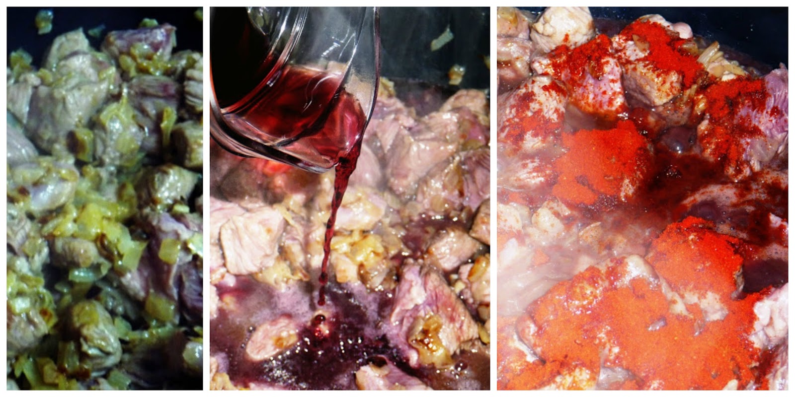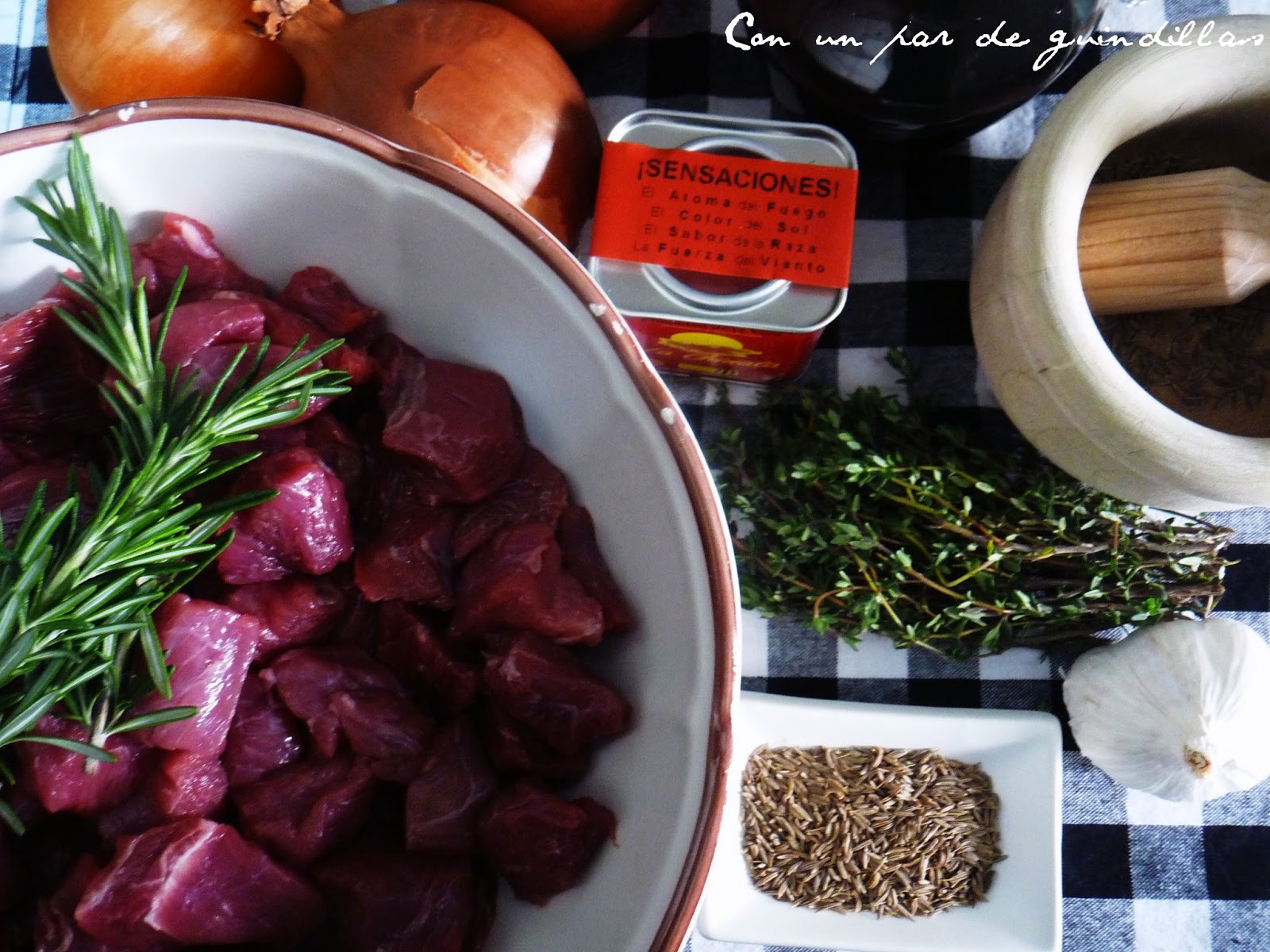 ingrediente particularmente importante en el caso de un goulash al estilo húngaro.Y hete aquí que por fin lo conseguí ¡y por partida doble!, os cuento: resulta que estando en Granada con motivo de Gastrotur 2013 descubrimos una tienda de especias al lado mismo de la Catedral ¡y tenían semillas de alcaravea!. Pero es que, casi a la vez, nuestra amiga Elena nos consiguió alcaravea molida (y menos mal, porque fue imposible moler las semillas en el mortero). El Goulash es un guiso tradicional de origen húngaro extendido por toda Centroreuropa. Se trata de un estofado con ingredientes básicos que no son otros más que la carne de ternera (aunque se hace con cerdo, cordero, etc.), el pimentón (paprika), cebolla, alcaravea (si no encontráis alcaravea, sustituidla por comino, la mitad de cantidad) y manteca. Nada más. En nuestro caso hemos sustituido la manteca por AOVE y mantequilla, hemos añadido vino tinto, tomillo y romero y por último comentaros que lo acompañamos con patatas en lugar de lo tradicional, que sería spaeztle, una masa elaborada con harina, agua y huevo, muy sencilla de realizar pero difícil de rematar su imagen si no dispones de la máquina para darles forma, sin embargo todo el mundo podrá disponer de patatas y si no, pues sin acompañamiento. Comentar por último que hay muchas recetas que incorporan tomate e incluso pimientos en la elaboración. No es lo tradicional, pero si os gusta adelante, nosotros no lo hacemos.