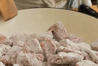- Para el Goulash, cortar la carne en cubos medianos (ni muy grandes ni muy chicos), colocarlos en una fuente y cubrirlos con harina. Mezclar bien para que toda la carne quede cubierta en harina.