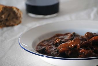 Salpimentamos la carne y la enharinamos, la sellamos en la cazuela en abundante aceite de oliva. Retiramos y reservamos. En el mismo aceite, rehogamos la cebolla cortada pequeña con los ajos. Cuando esté tierno añadiremos las zanahorias cortadas en rodajas finas y dejaremos que se cocinen unos 5 minutos. Yo use un tarro de tomate frito casero que nos regaló Aneto en la feria de Alimentaria, todavía no ha salido a la venta pero intuyo que va a ser la bomba cuando lo haga. Es realmente bueno, nada que ver con ningún tomate comprado. Vosotros en la receta usad una salsa de tomate hecha en casa. Añadimos las cucharadas de tomate y integramos todo, dejamos un par de minutos. Incorporamos la carne dando un par de vueltas con una cuchara de madera para que se impregne de la salsa. Añadimos la cucharada colada de pimentón y volvemos a remover. Añadimos un vaso de vino y dejamos 5 minutos a fuego vivo mientras removemos. Añadimos el resto de vino y agua, retocamos de sal y dejaremos cocinar a fuego mínimo durante 30-45 minutos o hasta que vosotros veáis que la salsa ya tiene la consistencia deseada. Yo lo hago de un día para otro, de esta manera el guiso tendrá los sabores mucho más reposados.