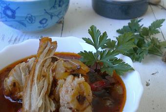 Sugerencias: En casa solemos comerlo de la siguiente forma; cada uno se echa en su cuenco un poco de caldo especiado con verduras, pellizcar la carne con unas pinzas o un tenedor en tiras (se desprende con mucha facilidad, está super tierna) y se corona con una cucharada de crema agria. Todo esto servido con el aromático arroz basmati. Os encantará!!