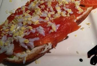 AHAAAAMMM.... Lo dicho, un bar de semejantes dimensiones, con tres camareros, uno de ellos, a modo de estatua, y el otro de traductor, para un sábado noche. Pues bien. Estoy por pasarles mis tarifas para una sesion de organización de empresa. Conseguimos pedir, yo con ganas de comer la "tostada con queso mascarpone, crema de aguacate y salmón ahumado", que resultó ser lo que pedí la anterior vez, y fue un fiasco. Y esta vez...pues otro fiasco. Resultó ser la misma loncha de salmón helado, con queso philadelphia (con todos mis respetos al queso philadelphia), y con tres gajos de aguacate. Y todo por el móoodico precio de 4 lereles, como dirían los Manueles.
