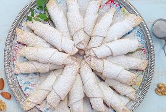 Obtenemos 24 rollitos.Pueden rellenarse con almendras, nueces, pistachos, avellanas.La receta original lleva cardamomo, pero como en casa no nos gusta no lo puse.La masa no lleva azúcar, pero la que lleva el relleno es suficiente y además al azúcar glas por encima le aporta más dulzor.Podemos conservar en un recipiente cerrado, como una lata.
