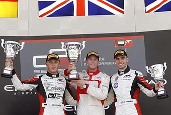 Stoneman continuó su excelente estado de forma con una victoria magnífica en la primera carrera en el circuito de Yas Marina. Este piloto sacó lo mejor de del hombre de la pole: Marvin Kirchhofer (ART Grand Prix) y se aferró a asegurar la victoria a pesar de la presión del alemán. Dino Zamparelli se unió a la pareja en la tribuna en la tercera casilla.Kirchhofer bombardeó la oposición en la calificación de ayer para establecer su segunda pole de la temporada, pero Stoneman era más rápido en la salida y lideró antes de la primera vuelta. Zamparelli fue también muy rápido, haciendo un comienzo brillante de quinto en la parrilla hasta la tercera casilla. El recién coronado campeón de la GP3 Alex Lynn de Carlin, perdió un lugar en el inicio después de una mala largada.
