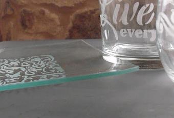 Grabamos vidrio con ácido y plantillas,si son adhesivas mejor y si son normales os aconsejo usar un pegamento reposicionable para fijarlas porque sino quedan bien pegadas se colará el ácido y se perderá la nitidez del dibujo a grabar.