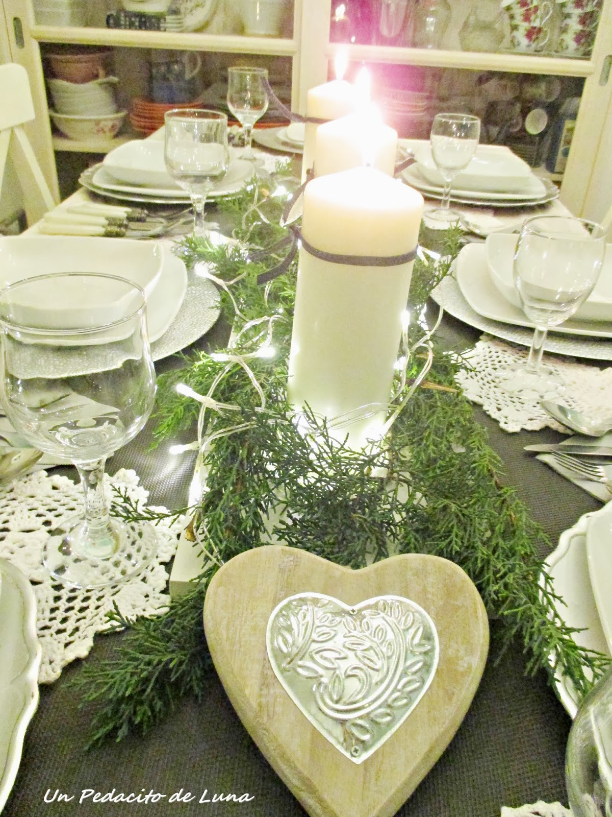 La mesa era muy sencilla: Mantel beige perlado con un camino de mesa de rafia en tono gris, en el centro, una tabla (que tenía preparada para un cartel) con velas encima, ramas de pino fresco y luces leds, rematada en los bordes con unos corazones de madera y latón labrado.Bajoplatos en tono plata, vajilla blanca cuadrada y unos pañitos de ganchillo a modode posavasos. La tabla decorada hubimos de retirarla para colocar las fuentes con la comida, la mesa abierta mide dos metros, pero es estrecha al fin y al cabo.