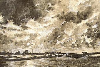 Esto es lo que se ha utilizado para el primer dibujo, una nubosa puesta de sol en Torrevieja. Aplicando baños disueltos en diferentes intensidades se han pintado las nubes. Como íbamos de pruenas, se ha frotado con el dedo, extendiendo el grafito, igual que si se hubiera aplicado con un lápiz blando. Se sacan blancpos con la goma de borrar. Como no tenía a mano blanco en lápiz o barra de Conté, se han hecho algunos brillos con un rotulador de este color. Mejor hubiera sido ponerse a buscar, pero así quedó. Creo que tiene posibilidades. Tengo que probar mezclándolo con sanguina en lápiz o en barritas de Conté.