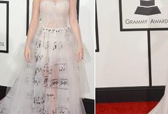 Que los Grammy son unos premios importantes creo que está claro pero no me terminan de encajar los vestidos con colas laaaargas en su alfombra roja. Katy Perry estaba muy original con su Valentino musical pero si le quitamos las corcheas poco más tenía... El vestido de Keltie me parece una opción muy chula para una novia -eso sí, cerrando un poquito el escote- aunque me parece demasiado para los Grammy.