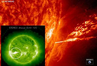 La vieja mancha solar 1936 localizada ahora justo en la extremidad Oeste del astro rey, ha producido una fuerte llamarada solar ésta mañana. En la imagen de STEREO Ahead se puede apreciar el momento de la llamarada al igual que en la SDO (Solar Dynamics Observatory).