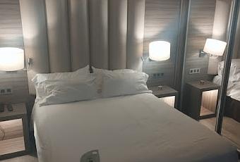 A la izquierda de la entrada queda la cama principal. Grande para ser individual algo pequeña para ser doble. Sobre un generoso y cómodo colchón se ofrece un suave nórdico en blanco con cuatro almohadas mullidas. A los pies, sobre una cartulina que explica los servicios ecológicos del hotel, un puñado de caramelos. La cama aparece empotrada contra un cabecero casi hasta el techo de madera y piel clara mullida en capitoné. A cada lado sendas mesillas a juego. Sobre una, el mando de la televisión y un teléfono. Enchufes e interruptores disponibles. Por encima sendas lámparas de corte moderno en metal y tulipa de tela cruda con reflectores -que no funcionan- para la lectura en la cama. El descanso que provee la cama es formidable pero la insonorización interior es prácticamente inexistente y se escuchan los pasos por el pasillo, las voces y ruidos de las habitaciones cercanas... La sonoridad exterior también resulta molesta por el permanente ruido durante la noche de algunos fancoils y aparatos de ventilación.