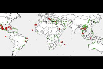Figure 10. Geographic distribution of 1000 caves in which native pholcid spider species have been found. Green: non-troglomorphic; red: troglomorphic. (Extraído del trabajo mencionado. DOI: https://doi.org/10.3897/subtbiol.26.26430.figure10)En él se hace una revisión de de araneidos de la familia Pholcidae en cuevas a nivel mundial. Un total de 473 especies de esta familia colectadas en 1000 cavidades. Un trabajo increíble que podéis leer y descargar en: