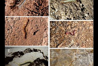Figure 3. Centipedes from Brazilian caves in loco. A Sphendononema guildingii from limestone caves of Serra do Ramalho, Bahia state (A. Gambarini) B Sphendononema sp. from sandstone caves of Igatu, Chapada Diamantina, Bahia state (E.C. Igual) C Scolopocryptops miersii from limestone caves of Serra do Ramalho, Bahia state (A. Gambarini) D Otostigmus tibialis from granitic caves of Florianópolis, Santa Catarina state (M.E. Bichuette) E Scolopocryptops troglocaudatus from Igatu, Chapada Diamantina, Bahia state (E.C. Igual) F Ribautia sp. from a limestone cave of Peruaçu, Minas Gerais state (P.P. Rizzato). (Extraída del trabajo anteriormente citado DOI: https://doi.org/10.3897/zookeys.737.20307.figure3)En este trabajo se ofrecen 48 especies, de 18 géneros y 10 familias distintas, así como de 4 órdenes diferentes, localizadas en 274 cavidades de Brasil. Un trabajo fascinante que además es de libre acceso y podéis leerlo y descargarlo en la web de la revista: