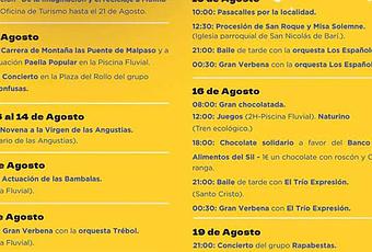 Durante el mes de agosto se celebrará la novena a la Virgen de Las angustias del 6 al 14 de agosto. El día 13 actuación de Loas Bámbalas. El 14 gran verbena y los días grandes llegarán el 15, 16 y 17 de agosto con las actividades que puedes ver en la imagen