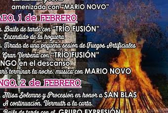 El sábado 1 de febrero a las 20:00hh Comenzará el baile con el Trío Fusión, la hoguera se encenderña a partir de las 22:30h a la medianoche, pequeña sesión de fuegos artificiales y continuará la fiesta con verbena y DJ.