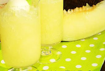 Servimos en copas pequeñas con una pajita. Decoramos con una bola de melón que podemos hacer con un vaciador de fruta o una cucharita.