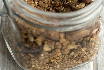 1. Mezclar los líquidos: agua, miel, aceite 2. Poner el cazo al fuego y dejar que se forme un jarabe 3. Mezclar las semillas, los copos, los frutos secos, etc (menos las pasas). 4. pincelar con aceite una bandeja de horno o una fuente de base amplia. 5. Bañar la mezcla de semillas con el jarabe y poner esta mezcla sobre la bandeja 6. Hornear durante unos 40 minutos a una temperatura de 140ºC pero removiendo la masa de vez en cuando. 7. Retirar del horno cuando tenga un bonito color dorado y añadir las pasas. 8. Guardar en un bote de cristal hermético.